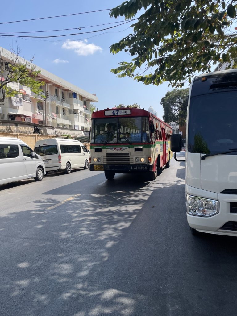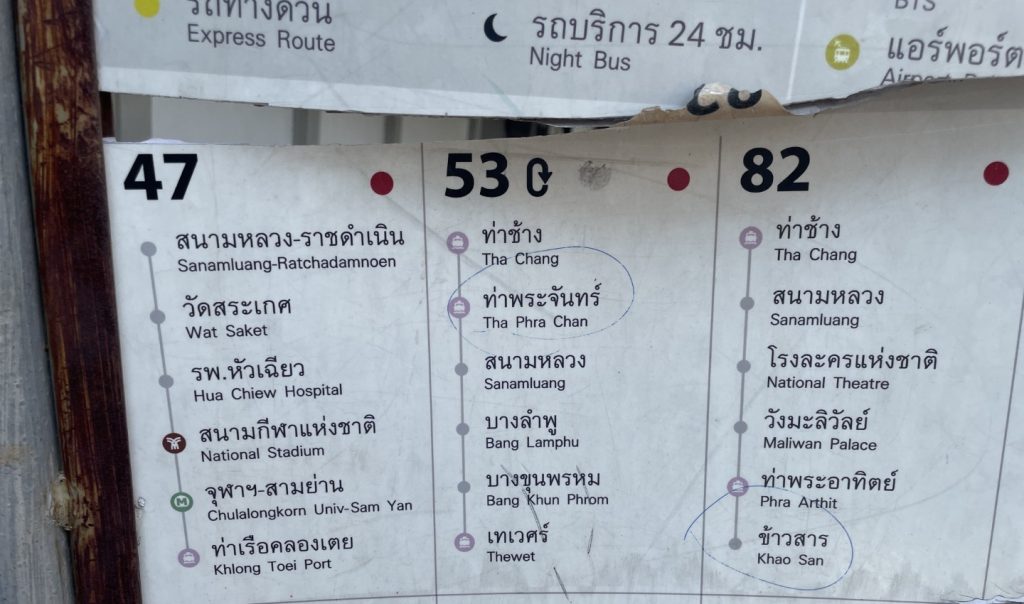 左方向を少し歩いたところに「Rajinibon School」というバスの停留所がるので、そこから最寄りの「Tha Maharaj(マハラート船着き場)」で降ります。写真のバス番号ならどれでも止まります。赤バスなら片道8バーツ。