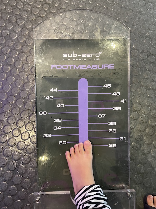 スケート靴のサイズは足の計測器が置いてあるのでここで測ってからレンタル窓口でサイズを伝えます。