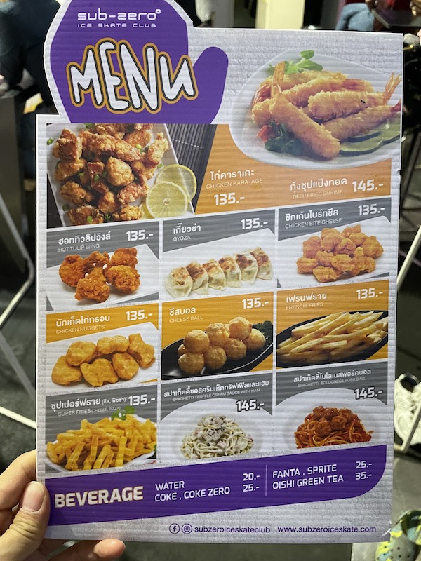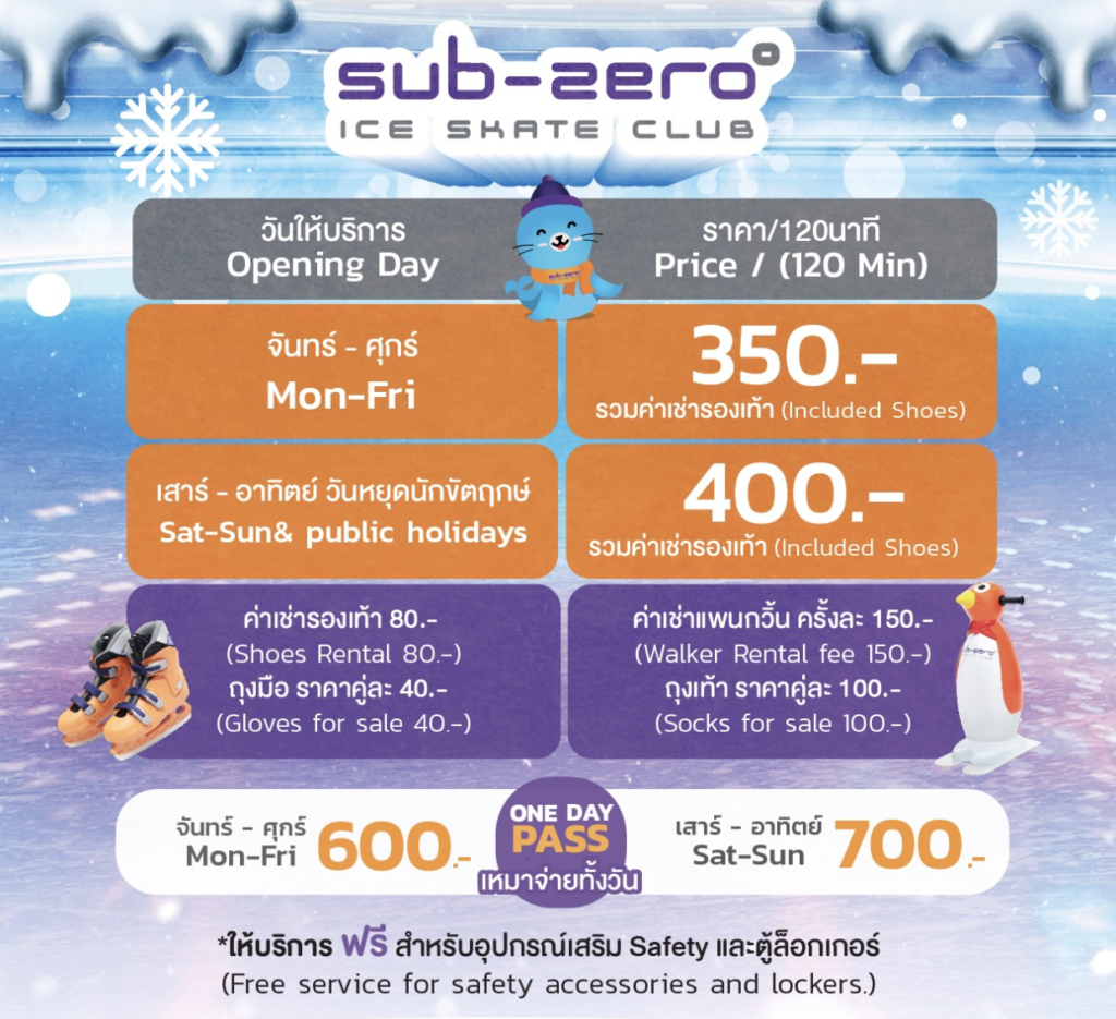 ・2時間利用:(平日)350バーツ(週末&祝日)400バーツ ※スケート靴代込み、延長15分間は無料