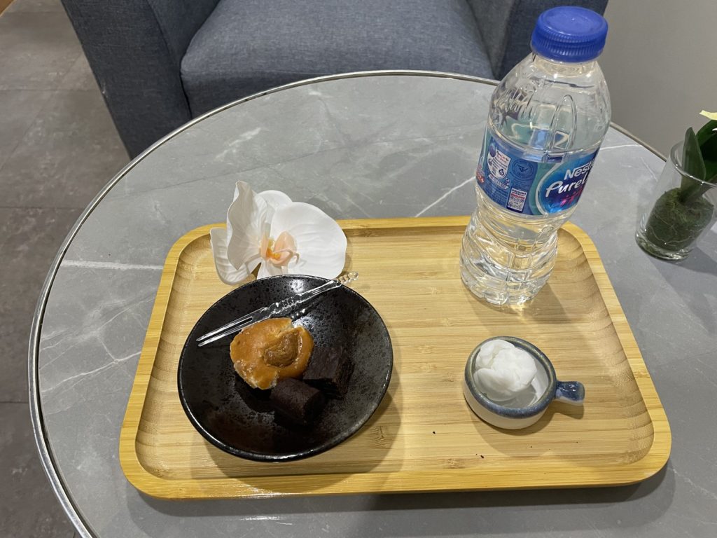 ドライヤーも早々に着替えて部屋から出ると、ご丁寧に濡れタオルと小菓子、アンケート時に選んだお水が用意されてました。