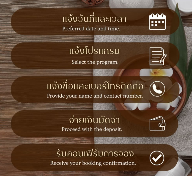 リクエストによって①人数➁予約日時➂プログラムを伝えると、名前と電話番号を聞かれました。その次に500バーツのデポジットを先にQRもしくは振込みで支払うと、最後に予約内容と注意点、行き方(画像)が送られてきて予約完了です。